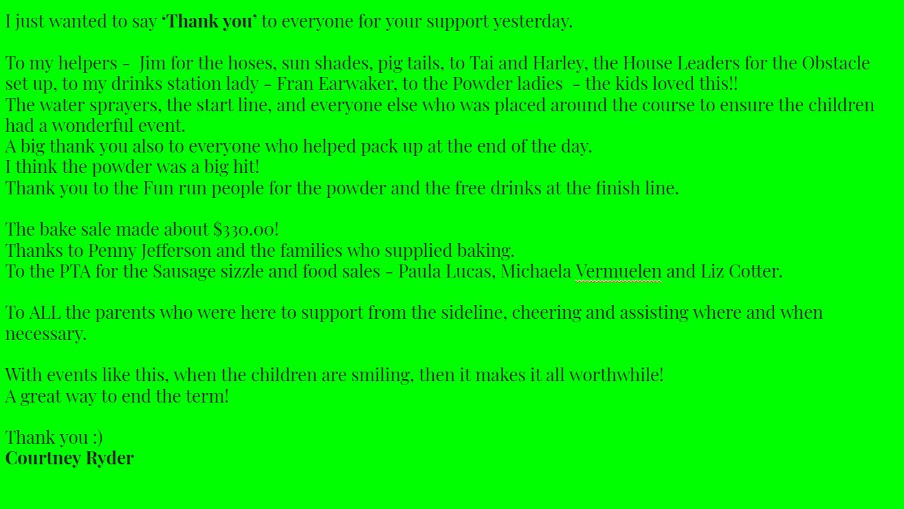 Ag Day Rosters: Last week you will have received an email from your child’s teacher about Ag Day rosters. Please email Jen Jamie ([email protected]) with your preferred 3 times and she will confirm back to you. Times start from 8.30am to 1.30pm and are for 30 minutes. We need all the help we can get to ensure Ag Day runs smoothly and are only asking for 30 minutes out of your day, please assist where you can. If you can give more than 30 minutes please let Jen know.